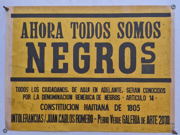 La obra incluye la frase “Ahora todos somos negros”, tomada del Artículo 14 de la Constitución Haitiana de 1805, que declaraba que todos los ciudadanos serían conocidos por la denominación genérica de “negros”, sin distinción de origen o clase. Romero recupera esta declaración revolucionaria como gesto político y poético, subrayando ideas de igualdad, identidad colectiva y crítica a las jerarquías raciales en América Latina.