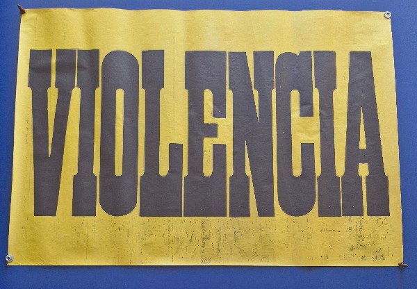 La obra presenta una única palabra —“VIOLENCIA”— impresa en gran formato, con tipografía industrial y alto contraste cromático, en una estrategia visual directa y confrontativa, característica del trabajo gráfico de Romero desde los años 60.