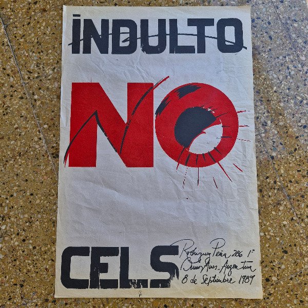 Afiche político original “INDULTO NO – CELS” (1989), impreso en el taller de Fernando “Coco” Bedoya, artista peruano-argentino, y EMEI, reconocidos por su gráfica militante vinculada a derechos humanos en América Latina.