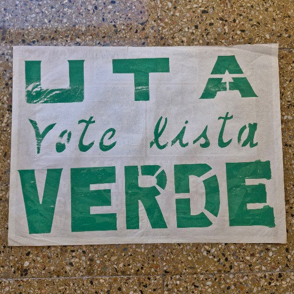 Afiche original de campaña sindical del gremio UTA — Unión Tranviarios Automotor — llamando a votar por la “Lista Verde”. Impreso en el taller de Fernando "Coco" Bedoya y EMEI. Año 1983. Información provista por EMEI.