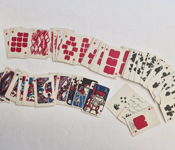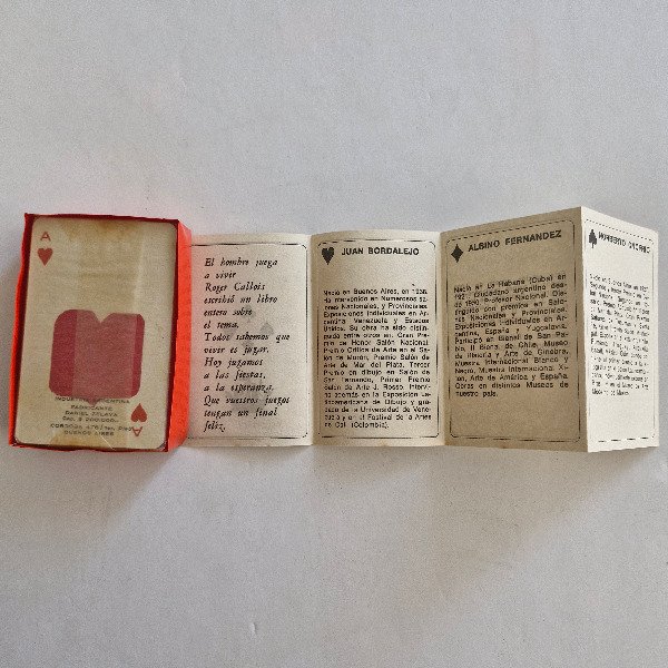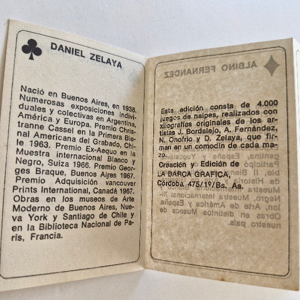 Juego de cartas de poker, con xilografías originales de Juan Bordalejo, Albino Fernández, Norberto Onofrio y Daniel Zelaya. Firmado por los artistas en un comodín. En estuche original. Ca. 1970. Excelente estado.