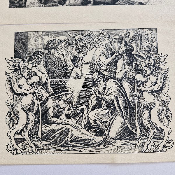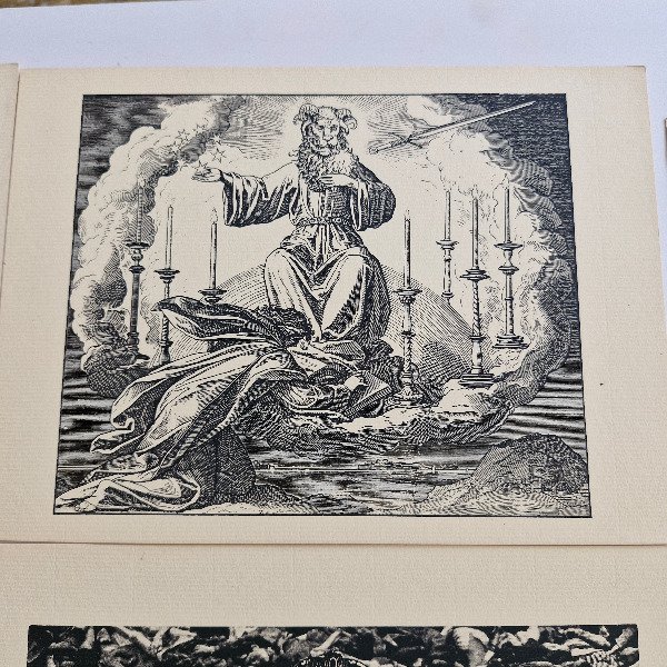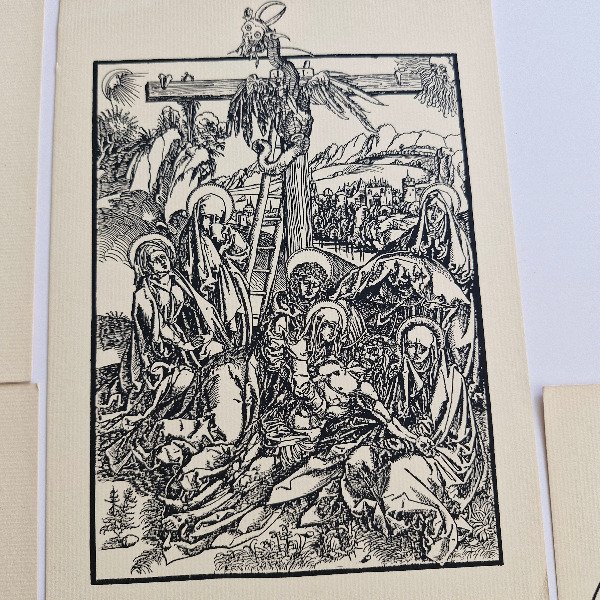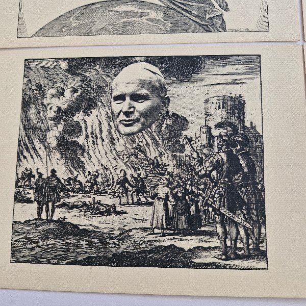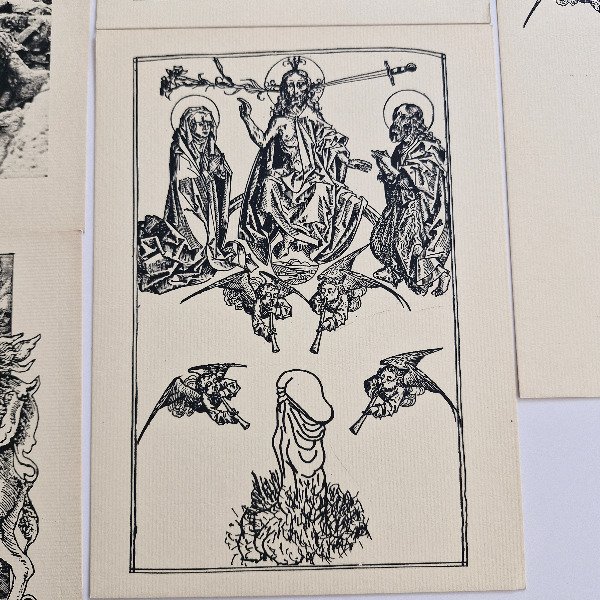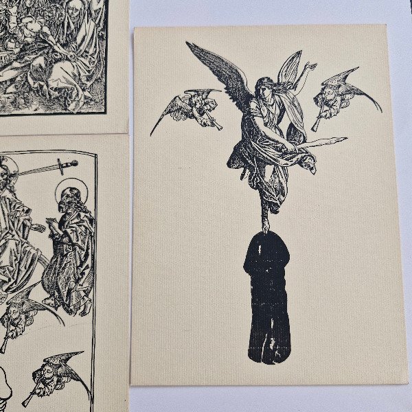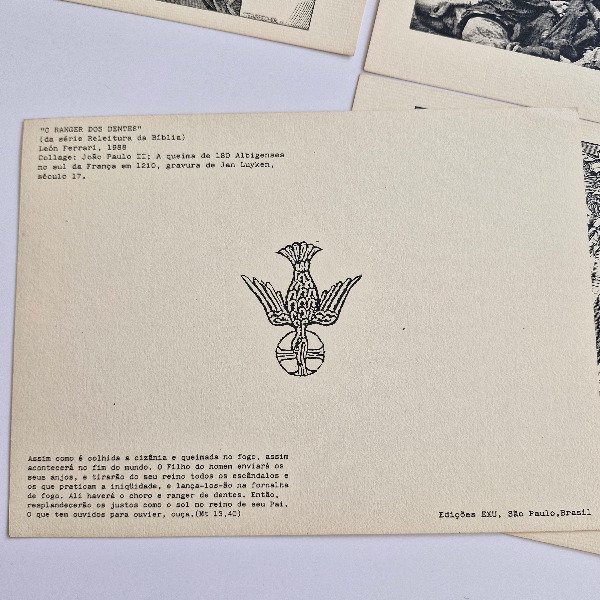 Se ofrece un conjunto poco frecuente de 9 postales editadas por Edições EXU, sello del propio Ferrari, durante su exilio en São Paulo. Estas piezas forman parte del proyecto “Relecturas de la Biblia”, en el que Ferrari reinterpretó escenas e iconografías cristianas mediante el collage, imágenes históricas y referencias políticas. No representan la totalidad de la colección, ya que Ferrari imprimió, al menos, 17 motivos distintos.