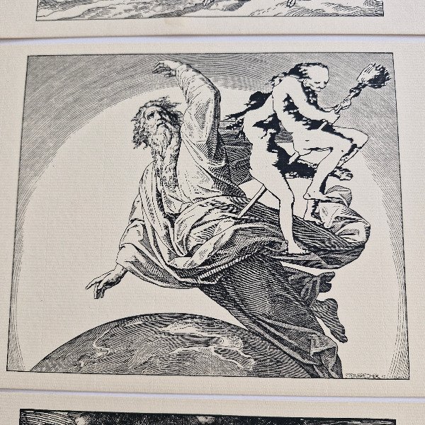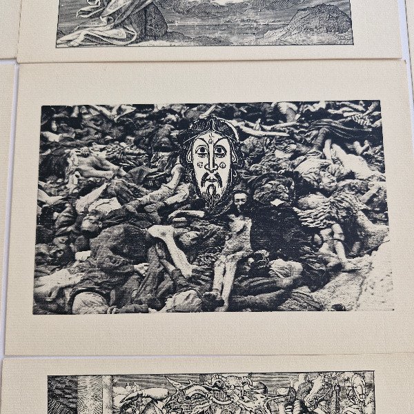 Cada postal reproduce un collage elaborado por Ferrari a partir de grabados de los siglos XVII al XIX (Jan Luyken, Gustave Doré, Cranach, entre otros), combinados con elementos contemporáneos, una de las marcas centrales de su lenguaje visual. Estas ediciones tuvieron tiras pequeñas y hoy son difíciles de encontrar.