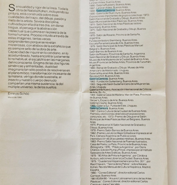 CV, retrato de la artista y texto de Ernesto Schóo al dorso. Muy buen estado. 55 x 26 cm.