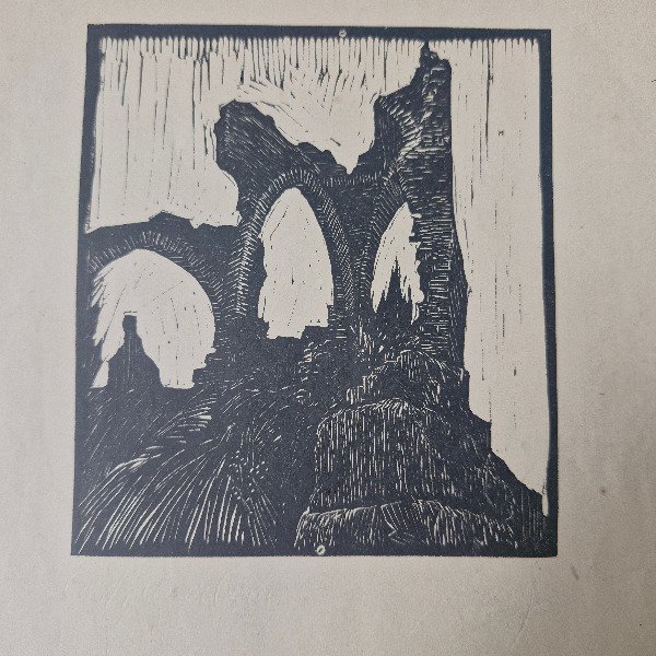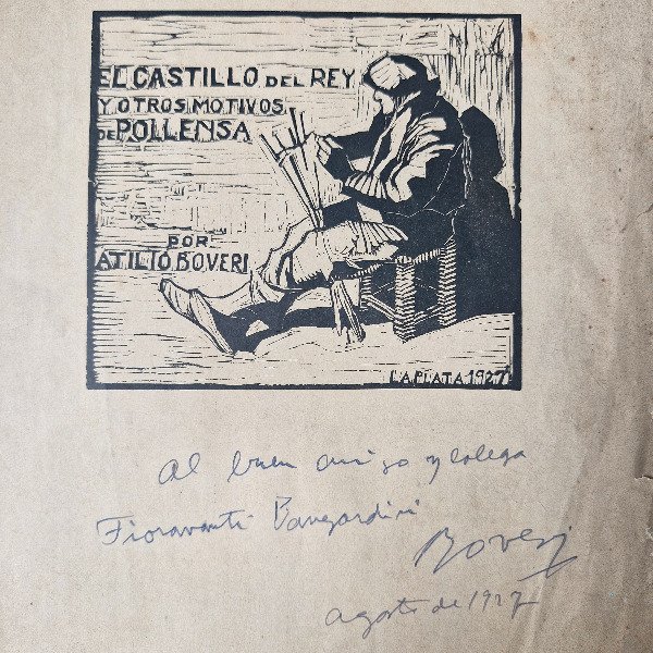 Atilio Boveri. Conjunto de 14 xilografías. Dedicadas, al pie de la primera, "al buen amigo y colega Fioravanti Bangardini". Numeradas del 1 al 20, faltan 6. Presumiblemente, ya faltaban desde la dedicatoria, escrita en la xilografía número 3. Buen estado general; algunas manchas y detalles marginales. Medidas totales de cada una: 34 x 25 cm. Precio por todas.