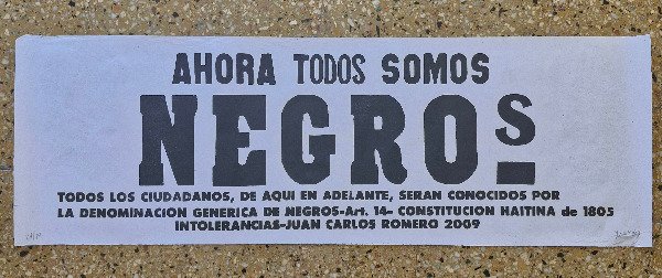 La obra incluye la frase “Ahora todos somos negros”, tomada del Artículo 14 de la Constitución Haitiana de 1805, que declaraba que todos los ciudadanos serían conocidos por la denominación genérica de “negros”, sin distinción de origen o clase. Romero recupera esta declaración revolucionaria como gesto político y poético, subrayando ideas de igualdad, identidad colectiva y crítica a las jerarquías raciales en América Latina.