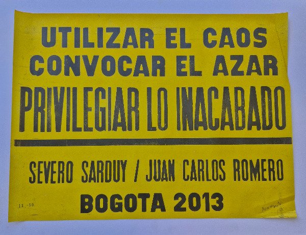 Juan Carlos Romero – “Utilizar el caos / Convocar el azar / Privilegiar lo inacabado” (2013). Afiche original Bogotá. 11/50.
